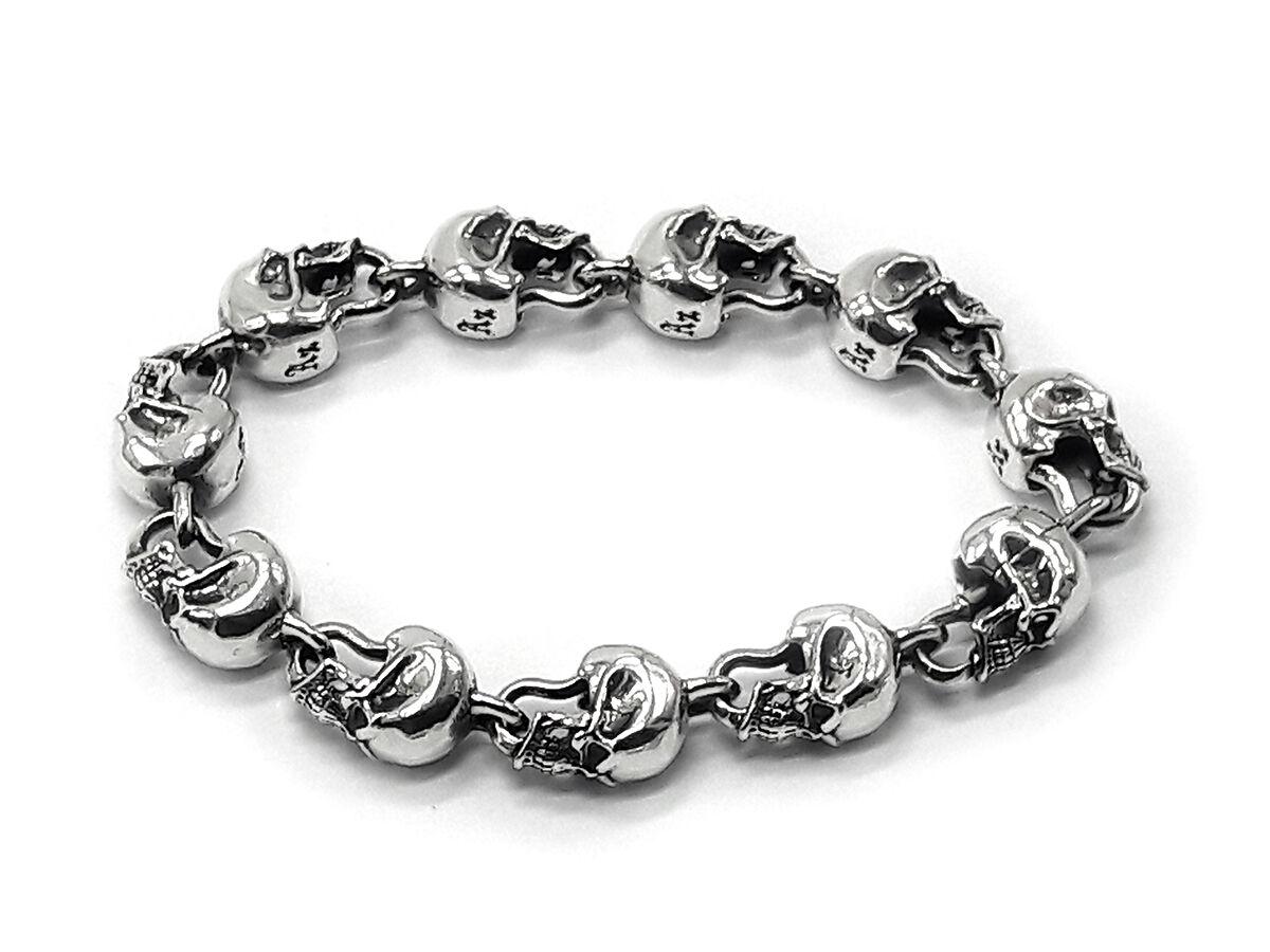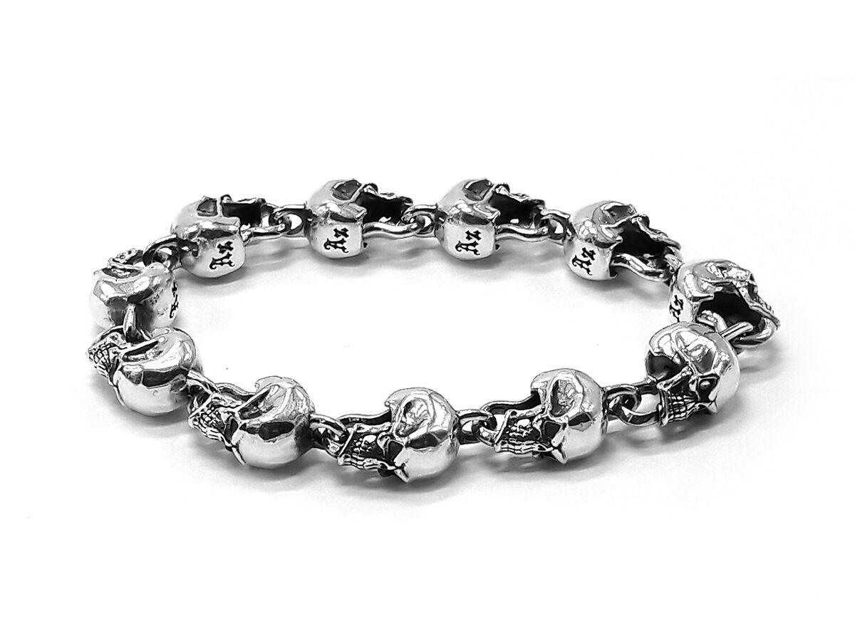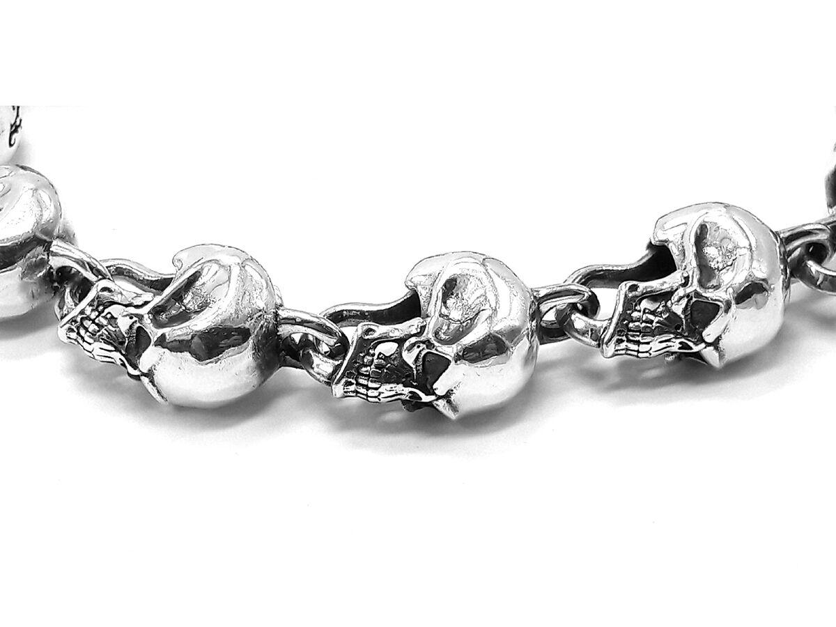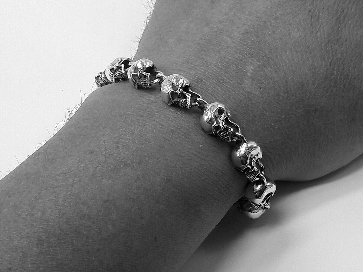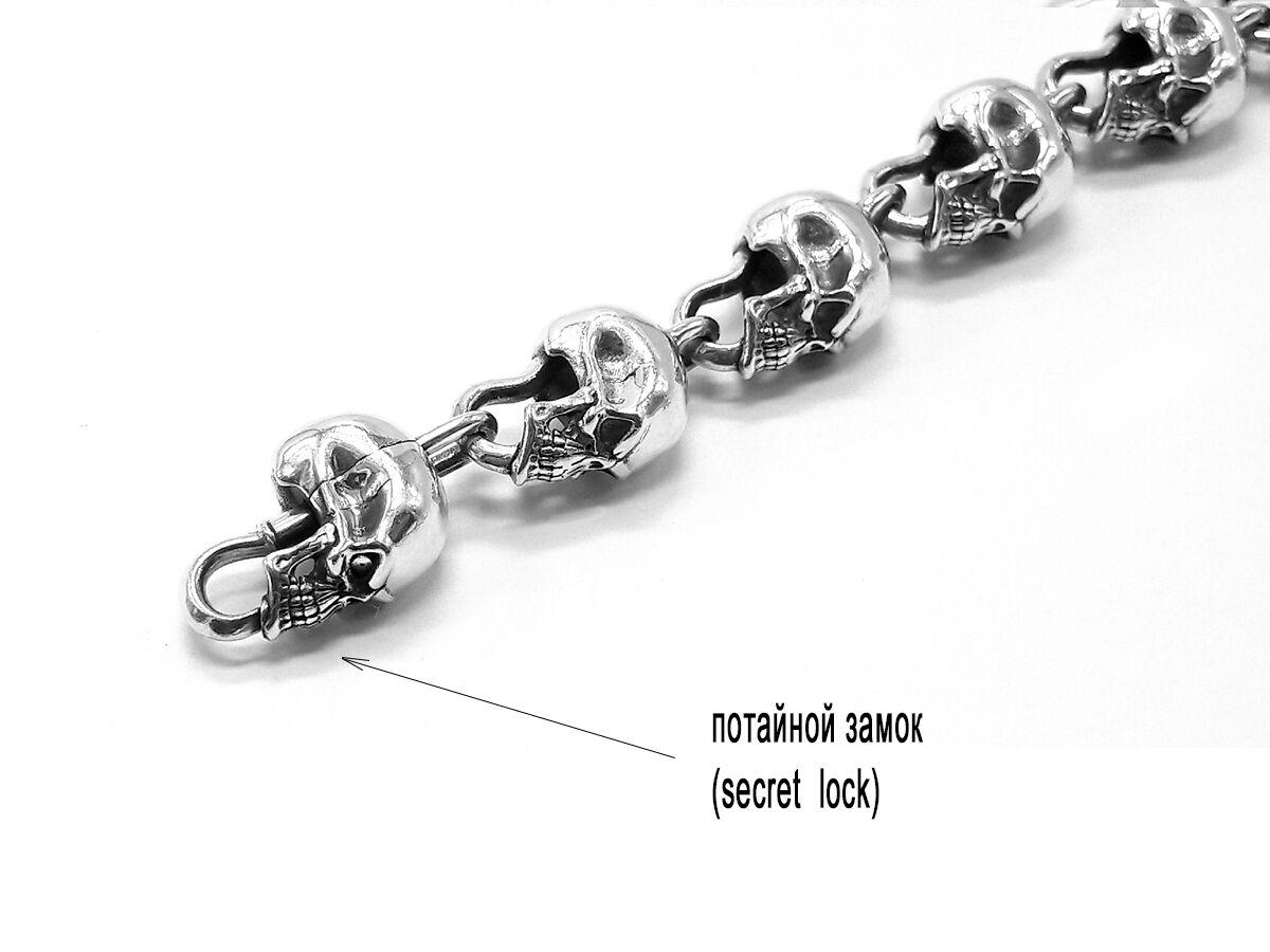 Браслет из оригинальных черепов авторского дизайна выполнен из серебра 925, Уникальный замок авторской разработки позволяет носить замок на любой части запястья, не нарушая ритмики и гармонии. Разработан именно с этой целью и является первым в мире подобным замком. Закрывается и открывается замок двумя способами